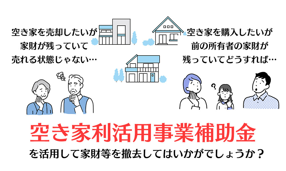 空き家及びその敷地内に散在する家財で、売買契約等又は移住に支障をきたす相当の理由があると認められるものの撤去、搬出及び処分家財等の撤去費用を補助対象経費とします。